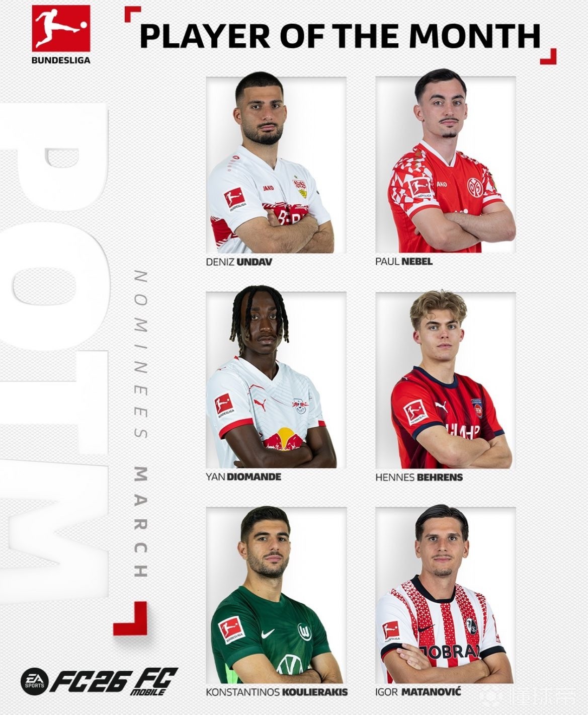德甲3月最佳球員候選名單公布,昂達夫領銜,迪奧曼德在列。
