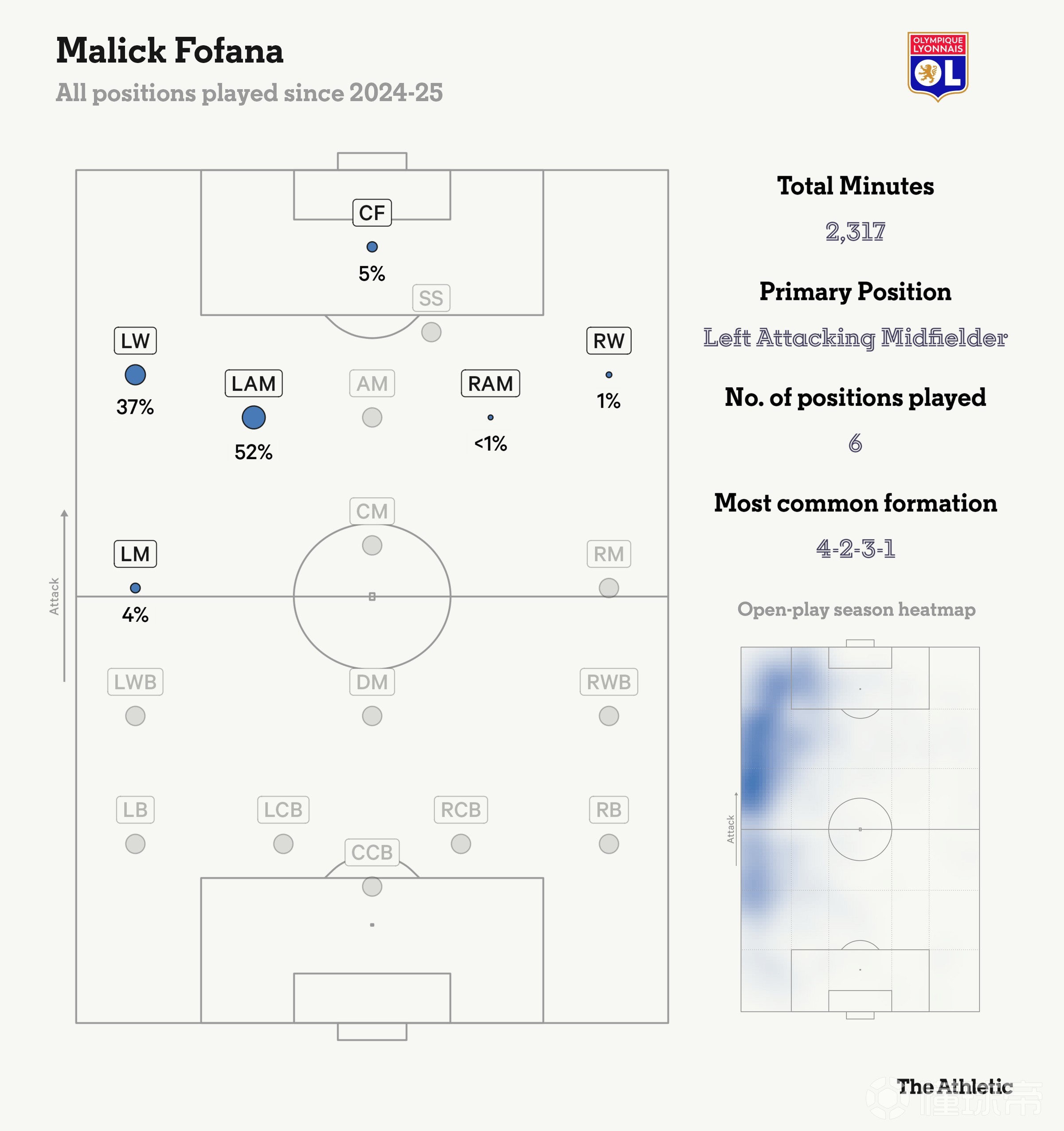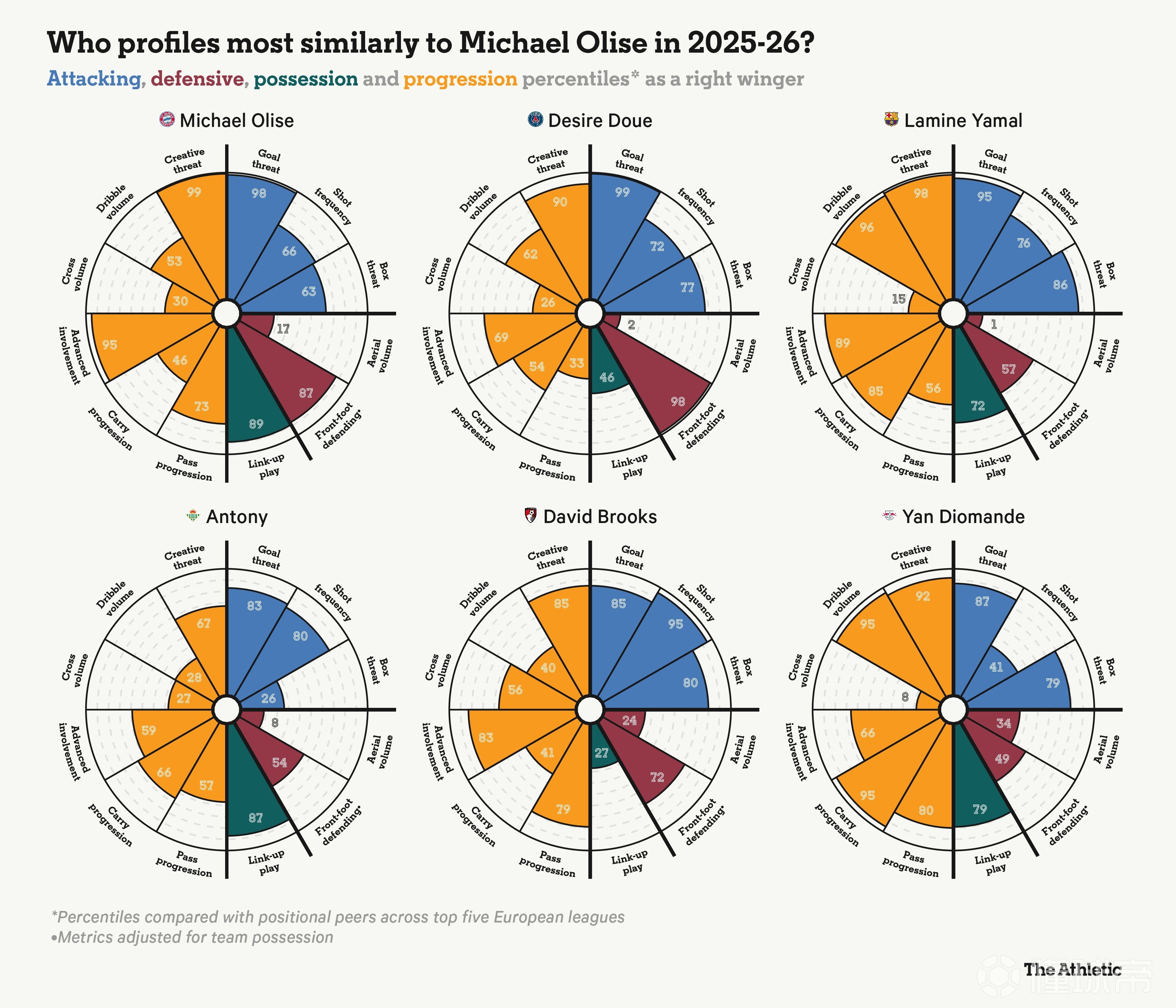 目前很少有左腳右邊鋒能達(dá)到更高的水準(zhǔn):在歐洲五大聯(lián)賽中,沒(méi)有人能比奧利塞的17次助攻更多。他擁有沉肩變向、在防守球員間穿梭以及在高速奔跑中完成致命一擊的能力,讓他成為足壇稀缺的“異類”球員。。