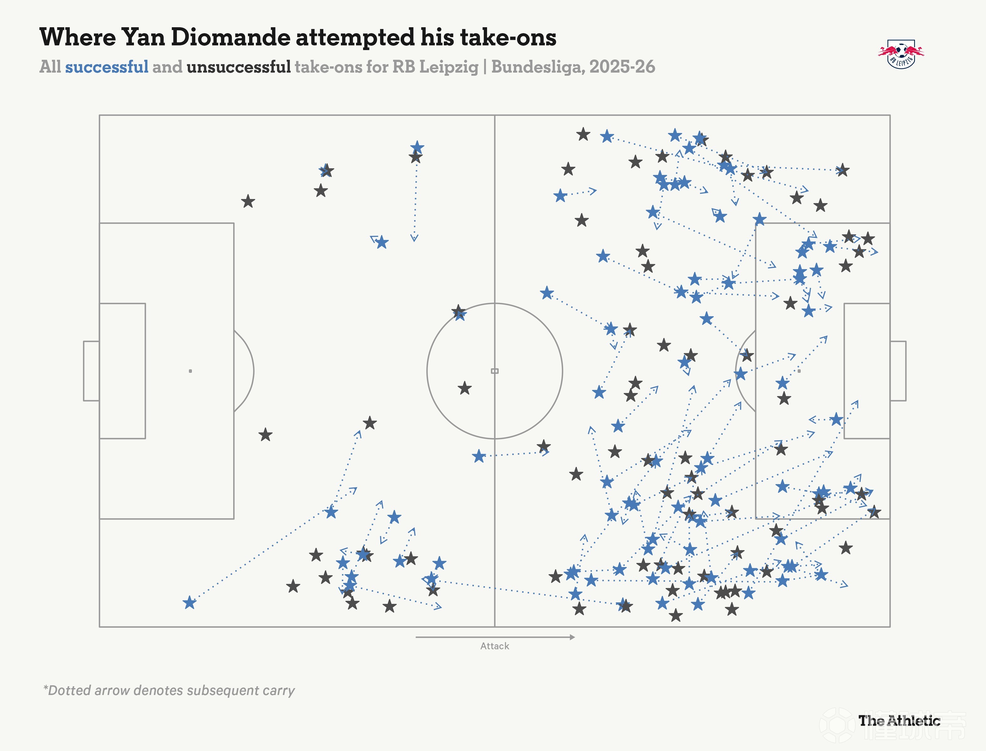 這位科特迪瓦國(guó)腳去年夏天才從萊加內(nèi)斯轉(zhuǎn)會(huì)至RB萊比錫,但已引起廣泛關(guān)注。如上圖所示,迪奧曼德非常喜歡盤帶……非常頻繁。在歐洲頂級(jí)聯(lián)賽所有球員中,只有維克托-穆尼奧斯(奧薩蘇納)、維尼修斯(皇家馬德里)和亞馬爾(巴塞羅那)的過(guò)人次數(shù)比他更多——如下圖所示,他能在兩條邊路都完成突破。